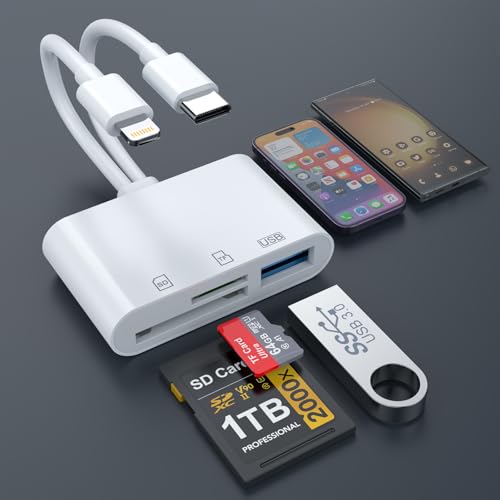 MFi認証のiPhone SDカードリーダー。Lightning/USB C対応で、USB3.0/SD/microSD変換アダプタ。双方向転送が可能で、高速伝送を実現。設定不要の簡単操作。日本語説明書付き。