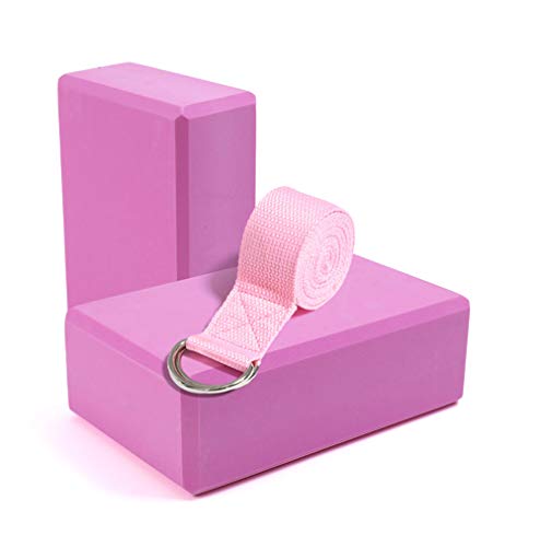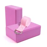 高密度EVAフォーム製のヨガブロックと引張ストレッチベルトのセット。ポーズのサポート、深化に最適。筋力・バランスの改善を助ける。ピンク色で可愛いデザイン。