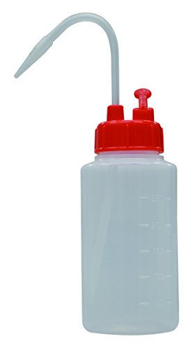 安元化成のNT洗浄瓶カラーキャップB型(コック付)は容量250mlの赤色ボトル。使いやすく、液体のストレートに供給可能。実験や清掃作業に最適なアイテムです。