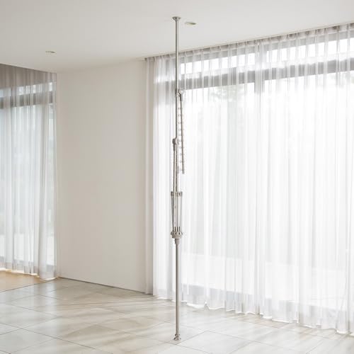 ディノスの室内外兼用洗濯物干し台。どこでもポールのワンタッチつっぱりデザインで、アーム2本と伸縮タオルハンガー付き。カラーはグレーで、使いやすさを追求した製品です。
