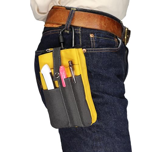 イエローの6ポケット多機能ワークポーチ。ベルト通しとカラビナ付きで、スマホ収納にも対応。小分け収納が可能な工具ポーチです。男女問わず使えます。