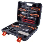 LEONTOOLの木製彫刻刀セットは、10本の彫刻刀、ホーニングガイド、研ぎ石、大工用鉛筆2本を含む。木工用の収納ケース付きで、初心者からプロまで使いやすい。