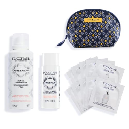 ロクシタンのレーヌブランシュトライアルセットには、クレンジングフォーム150mL、フェイスウォーター30mL、セラム1mL×10枚が含まれ、肌の明るさを引き出すスキンケアが体験できます。