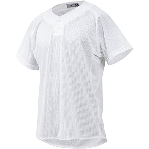 MIZUNOの練習用シャツ、セミハーフボタンタイプ。メッシュ生地で通気性抜群。野球向けデザイン。カラー:ホワイト。サイズ:L。快適な着心地を提供します。