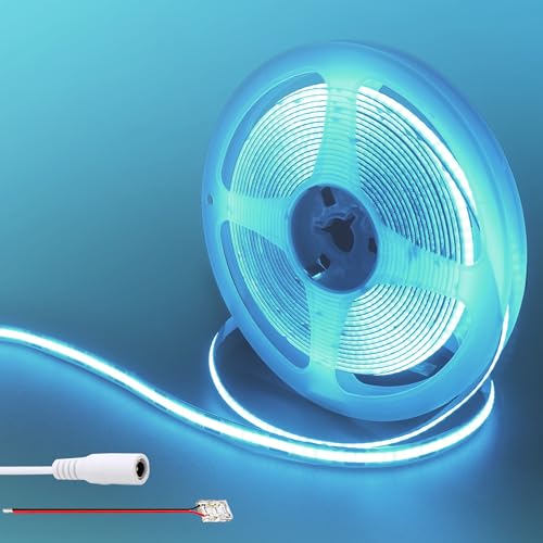 クリアヒルの12V COB LEDストリップライトは、5Mの長さで320LEDs/m、CRI>=80、10W/Mの明るさ。幅8mm、IP20非防水設計で、切断やDIYが可能。家庭インテリアに最適なアイスブルーライト。