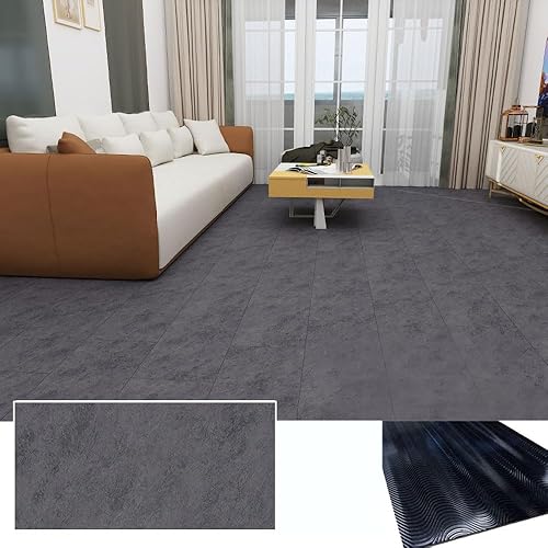 フロアタイルは大理石調の吸着タイプで、簡単に置くだけで施工可能。304x609mm、厚さ4mmで、接着剤不要。賃貸OKの防水・防汚仕様。土足OKで、リフォームやDIYに最適。6ケース54枚で約6畳分。