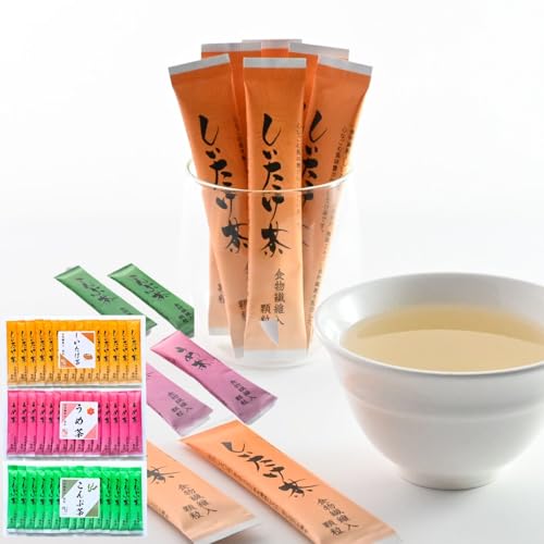 博屋のスティック粉末茶は、食物繊維入りの飲み比べセット。椎茸茶15本、うめ茶15本、こんぶ茶15本が個包装で1袋に入っています。手軽に楽しめる健康的なお茶セットです。