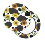 バースツールカバー ラウンド – 黒牛プリントひまわりデザイン。ソフトな滑り止め付きで、12インチのラウンドチェアにフィット。ゴムバンドでしっかり固定可能。
