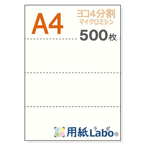 用紙LaboのA4白紙は、ヨコ4分割で使いやすいミシン目入り。重さは55Kg、500枚入り。マイクロミシン加工により、切り離しもスムーズ。多用途に対応した高品質な用紙です。