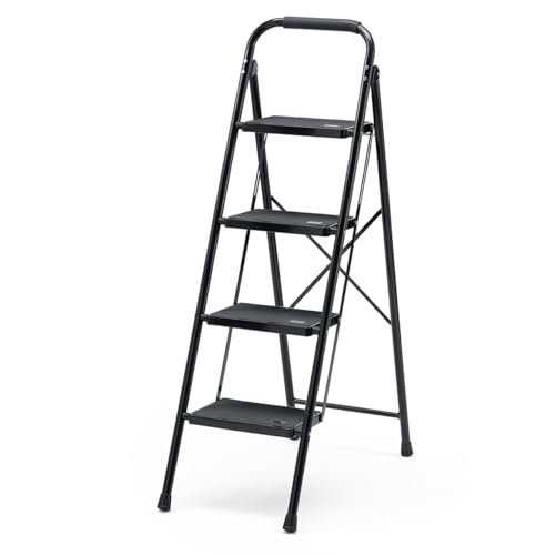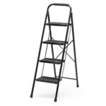 サンワダイレクトの4段折りたたみ脚立は、耐荷重150kgで滑り止めと手すり付き。家庭用や作業時に安全に使用できます。ブラックでスタイリッシュなデザインが特徴。