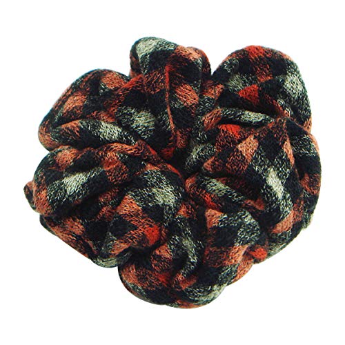 メロウストアのシュシュは、オレンジ、ブラック、グレーの混合カラーで、ニットチェックデザインが特徴のヘアアクセサリー。ワンサイズで、カジュアルなスタイルにも合わせやすいアイテムです。