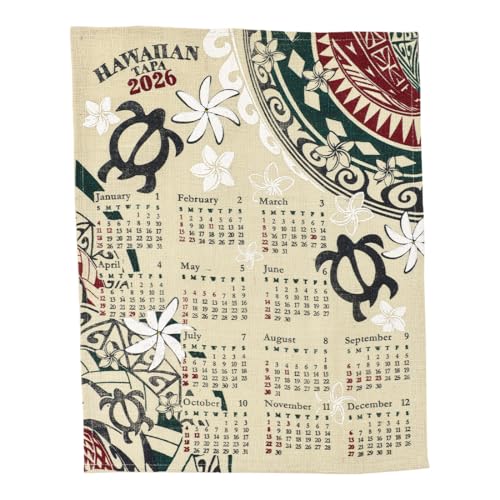 2026年版ハワイアンジュートカレンダーです。ハワイアンタパデザインで、リーフやモンステラ、海亀モチーフが使われています。インテリアやプレゼントに最適なアイテムです。