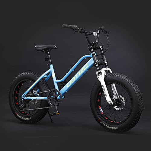 20インチファットタイヤのマウンテンバイク。ブルーの車体、7速の変速機能付き。ビーチや雪道でも滑りにくく、通勤や旅行に最適な全地形対応のMTBです。