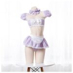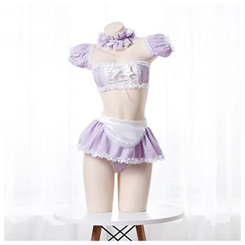 紫色のメイド服コスチューム、ナイトクラブ用の7点フルセット。スカート、タイツ、ネックリング、ブラジャー、Tパンツ、ブレスレット2個、エプロンが含まれています。仮装やパーティーに最適です。