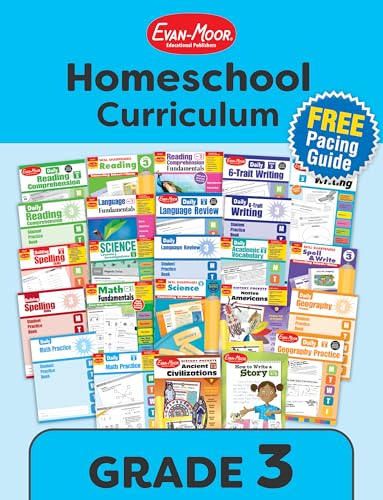 Evan-Moorのグレード3ホームスクールカリキュラムは24冊のワークブックで、読書、ライティング、数学、科学、地理、スペル、語彙、言語、社会科を網羅。ペーシングガイドも付いて学習をサポート。