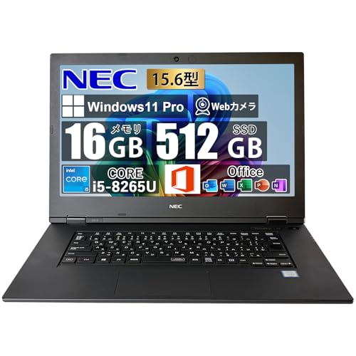 NEC VKT16 ノートパソコンは15.6インチディスプレイを搭載。第8世代Core i5-8265U、16GB RAM、512GB SSDを内蔵。Windows 11、Office付き。USB、Wi-Fi、Webカメラ内蔵の整備済み中古品です。