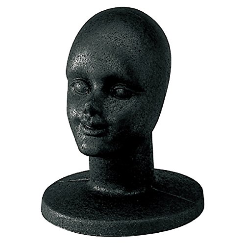 マネキンヘッドは黒色で顔付き、発泡スチロール製です。帽子ディスプレイ用スタンドとして最適で、ストア・エキスプレスの61-163-3-2_17580-742モデルです。