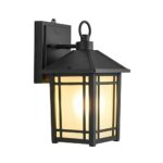 ファームハウススタイルのラージアウトドアウォールランタン。クリアガラス付きで、ダイカストアルミニウム製、ブラック仕上げ。ポーチやパティオに最適なヴィンテージ風エクステリアライト。