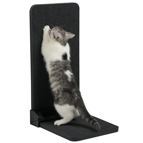 猫の爪研ぎL字型キャットスクラッチャー、段ボール製で壁に取り付け可能。トラックボールのおもちゃ付きで楽しめる!高さ56cm、スタイリッシュなブラックカラー。