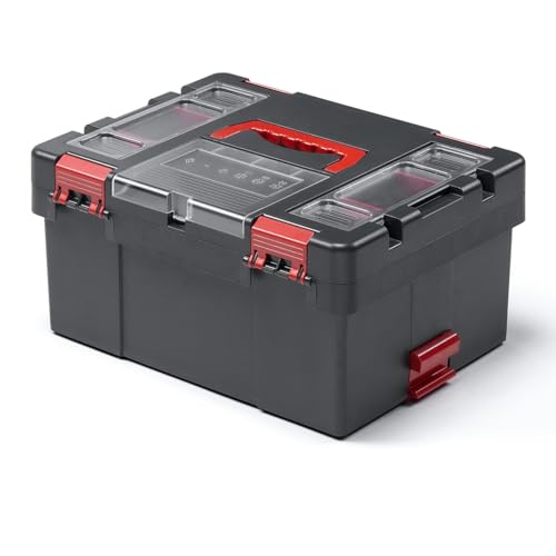 サンワダイレクトのMサイズ工具箱は、グレーのシンプルなデザインで、コンパクトながら収納力抜群。耐久性のある素材で作られ、工具や小物の整理に最適です。持ち運びに便利なハンドル付きで、家庭や作業場で重宝します。