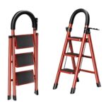 折りたたみ式の3段脚立は手すり付きで、室内・屋外使用に最適。耐荷重250KG、コンパクトで軽量、安定感抜群。足置きが広く滑り止め付きで持ち運びも便利。サイズ:106*4*43CM(レッド)。