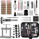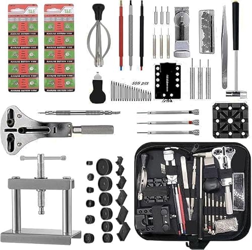 腕時計の電池交換に最適な工具セット。SR621SW電池付きで、ベルト調整や裏蓋開閉にも対応。精密ドライバー、ピン抜き工具、収納バッグ、説明書付き。
