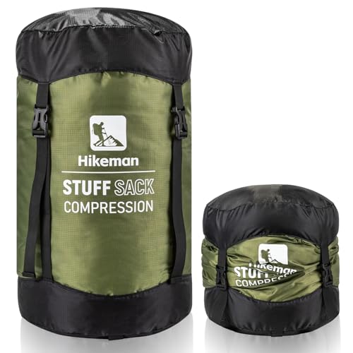 コンプレッションバッグは防水で、寝袋や衣類を50%まで圧縮可能。46L/32L/19Lの容量で、軽量かつ耐摩耗性に優れ、キャンプや登山に最適。アーミーグリーンのXXLサイズ。