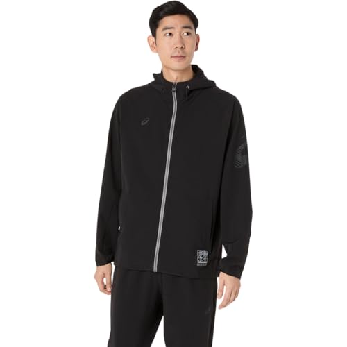 アシックスのトレーニングウェア、はっ水ストレッチウーブンフーディー2031F167はユニセックスで、パフォーマンスブラックのカラー展開。Lサイズで快適な動きやすさを提供します。
