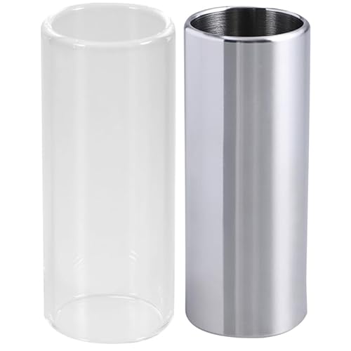 Alasumギタースライド2本セット。透明とシルバーのスライドバー、ショートとミディアムサイズ。エレキギター用のステンレスとグラス素材で、ボトルネック奏法に最適なアクセサリーです。