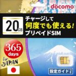日本で利用可能なドコモのプリペイドSIMカード。20GBのデータ通信が365日利用でき、4G LTEに対応。標準、マイクロ、ナノサイズの3in1 SIM。データ専用でテザリングも可能です。