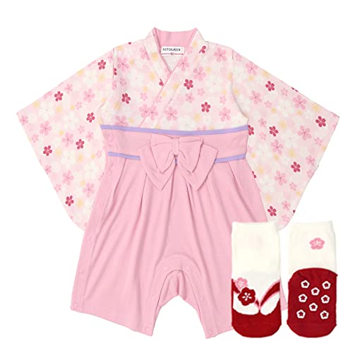 KOTOBUKIENの袴ロンパースは、靴下付きで和装フォーマルなデザイン。女児向けの着物スタイルで、お宮参りや七五三、お正月などの特別な日に最適。サイズは70cm、和柄が特徴です。