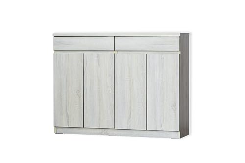 薄型カウンター収納。完成品で、サイドボードやローボードとしても使用可能。おしゃれな大理石柄と木目調のデザイン。引出しと扉付きで、リビングの収納に最適。(ホワイト)
