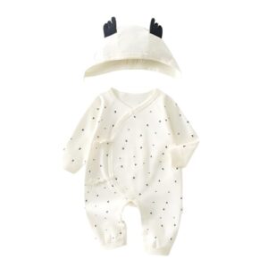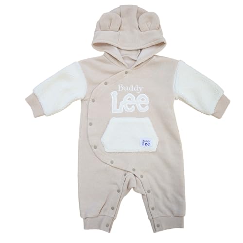 バディーリーのクマ耳フード付きカバーオール。長袖で裏パイル起毛、前開きタイプ。ベビー服として男の子女の子兼用。カラーはベージュ、サイズは70です。