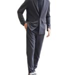 ジギーズショップのスリムテーラードジャケットとテーパードパンツのセット。サイズM、グレーで春のカジュアルスーツに最適。洗えるストレッチ素材で、おしゃれなビジネスカジュアルスタイルを演出。