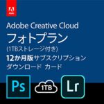 Adobe Creative Cloud フォトプラン(Photoshop+Lightroom)は、1TBのストレージを提供し、12か月間使用可能です。Windows/Mac対応のパッケージ版で、カードコードによる簡単な認証が特徴です。