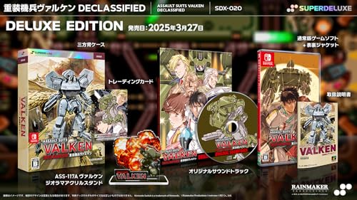 重装機兵ヴァルケン DECLASSIFIED DELUXE EDITION -Switchは、オリジナルクリアファイル、三方背ケース、アクリルスタンド、トレーディングカード、サウンドトラック、ゲームソフト、取扱説明書、ジャケットが同梱されています。