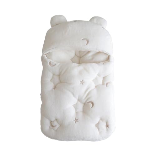プッパプーポのスリーピングバッグは、フランネル素材で赤ちゃんを包み込むおくるみです。星柄とアイボリーのデザインで、温かく快適な抱っこ布団として使用できます。
