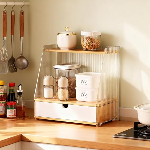 キッチン収納ラックは、アクリルと天然木材の組み合わせで耐久性に優れ、調味料や小物収納に最適です。単層/二層引き出しから選べ、リビングやコーヒー用品の整理にも便利です。