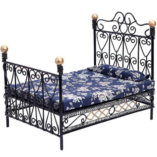 moin moin ミニチュア 家具 1/12 1:12 ドールハウス ベッド フレーム (敷布団 & 枕 付) ゴシック ブラック ゴールド 花柄 ブルー ネイビー フラワー アンティーク レトロ 2311mini35の高価買取