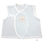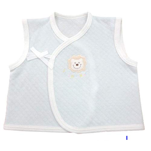 川端縫製の日本製やわらかニットキルトベビー用ベスト、色はサックス(ライオン)。新生児向けでサイズは50-70cm。ふんわりしたキルト素材がベビーにやさしいデザインです。