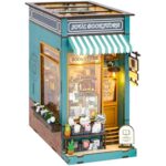 moin moinのドールハウスミニチュアキット。本型本屋のペーパークラフトで、英語説明書付き。ブルーの美麗なクラシカルデザイン、リアルなタッチ式LEDライト付。