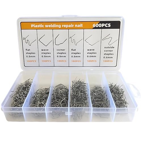 電熱ピンとプラスチックリペアキットのセット。6種のステープル付きで、バンパー補修やプラスチック溶接に最適。収納ケース付き、0.6mm/0.8mm対応の修理用工具です。