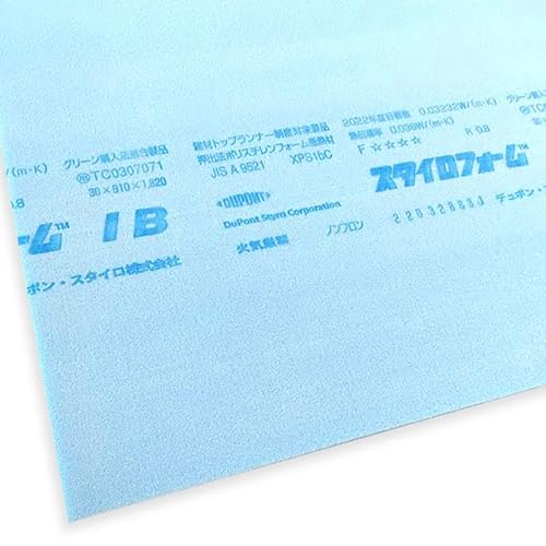 ブルースタイロフォームIBは、25mm厚でサイズは900×450mmの断熱材です。優れた熱断熱性能を持ち、建築物のエネルギー効率を向上させます。軽量で加工が容易なため、施工性も良好です。