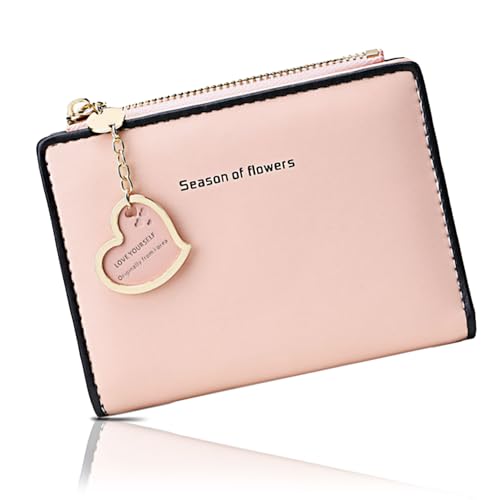 CROWNCATの二つ折り財布は、かわいいチャーム付きでファスナーが楽々。ワンタッチボタン式、便利なカード収納と小銭入れ付き。通勤・通学・定期入れとしても使えます。色はベビーピンクです。
