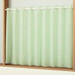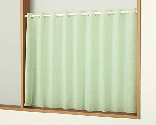 カーテン天国のカフェカーテン、外から見えないデザインで浴室に最適。2643木の実グリーン、幅140cm、丈90cmの1枚入りで、遮像効果が高く目隠しに便利です。