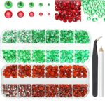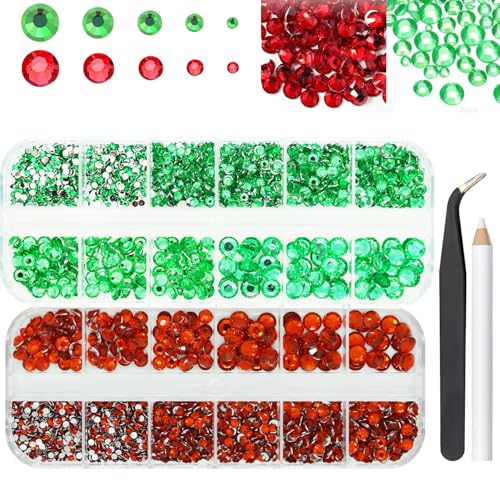 赤と緑のラインストーンビーズキット(2mm-6mm)、非ホットフィックスフラットバック。ネイル、DIYアート、メイクアップに最適なクリスタル宝石。