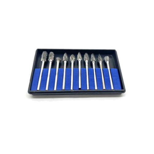 超硬バーリュータービット10本セットで、タングステン製のミニルーター用ドリルビットです。3mm軸、刃幅6mm、金属加工や彫刻に最適。耐久性が高く、ケース付きで持ち運び便利。