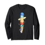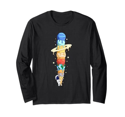 宇宙飛行士が惑星を巡る冒険をアイスクリームコーンで楽しむ長袖Tシャツ。天文学と太陽系をテーマにしたデザインで、宇宙好きにはたまらないアイテムです。