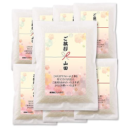 新潟産コシヒカリ2合×8個セット、令和7年産の美味しいお米。工事の挨拶にぴったりの和柄華イエロー包装。贈り物にも最適です。