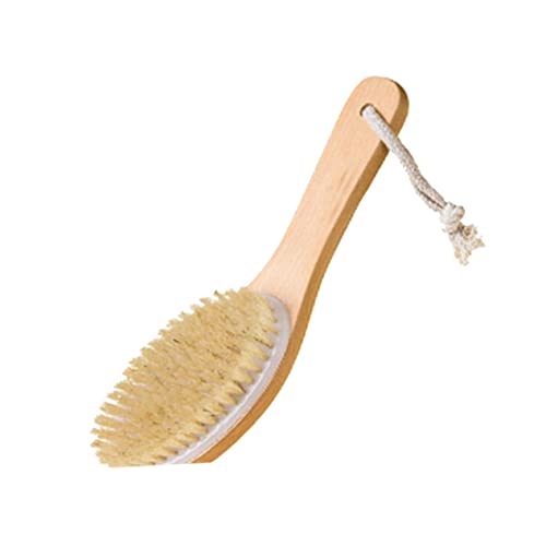 NULYLUの木製バスブラシは、天然猪毛を使用し、剛毛で素肌ケアに最適。25×7cmのサイズで、足腰のマッサージにも利用可能。持ち手と吊り紐付きで、バスルームに便利。